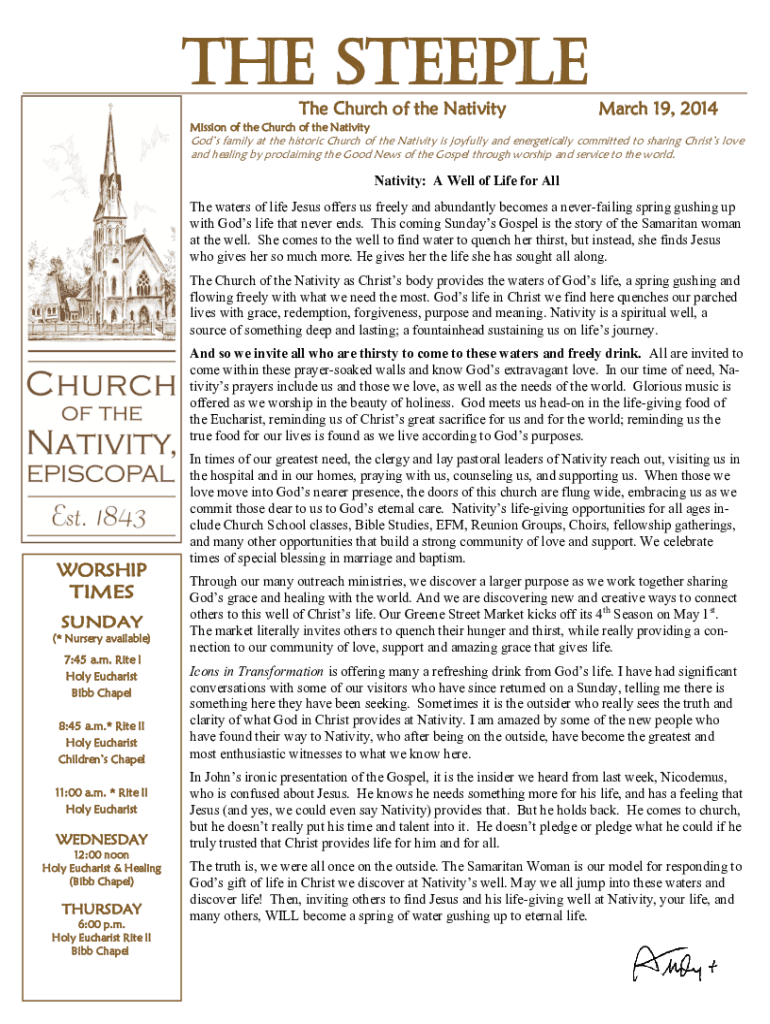 THE STEEPLE The Church of the Nativity March 19, 2014Mission of the Church of the NativityGods family at the historic Church of the Nativity is joyfully and energetically committed to sharing Christs