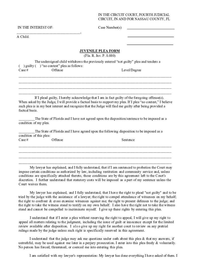 IN THE CIRCUIT COURT, FOURTH JUDICIAL CIRCUIT, IN AND FOR NASSAU COUNTY, FL IN THE INTEREST OF: ___, A Child. Case Number(s)JUVENILE PLEA FORM (Fla. R. UV. P. 8.080) The undersigned child withdraws