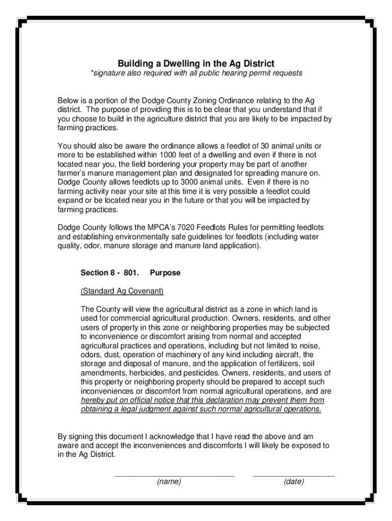 Building a Dwelling in the Ag District *signature also required with all public hearing permit requestsBelow is a portion of the Dodge County Zoning Ordinance relating to the Ag district. The purpose