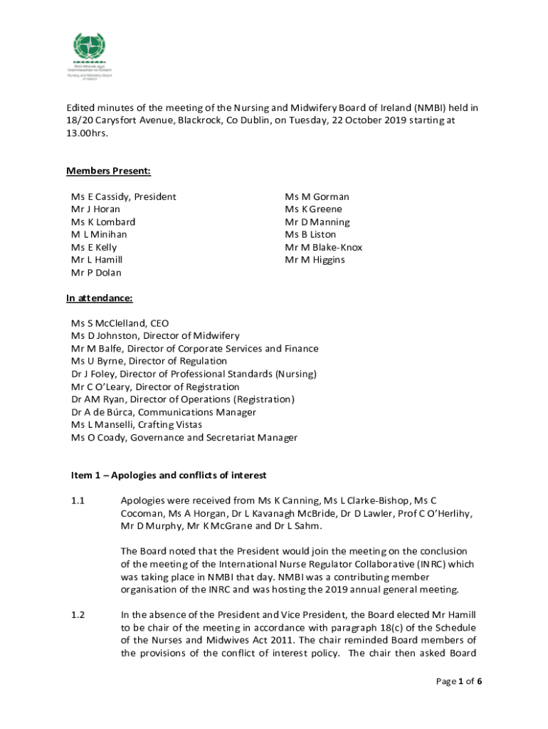 Edited minutes of the meeting of the Nursing and Midwifery Board of Ireland (NIMBI) held in 18/20 Carport Avenue, BlackRock, Co Dublin, on Tuesday, 22 October 2019 starting at 13.00hrs. Members Present: