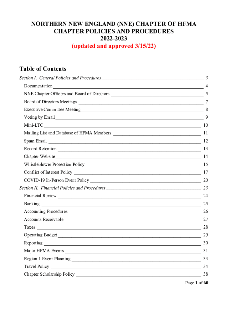 NORTHERN NEW ENGLAND (ONE) CHAPTER OF FMA CHAPTER POLICIES AND PROCEDURES 20222023 (updated and approved 3/15/22)Table of Contents Section I. General Policies and Procedures ___ 3 Documentation ___