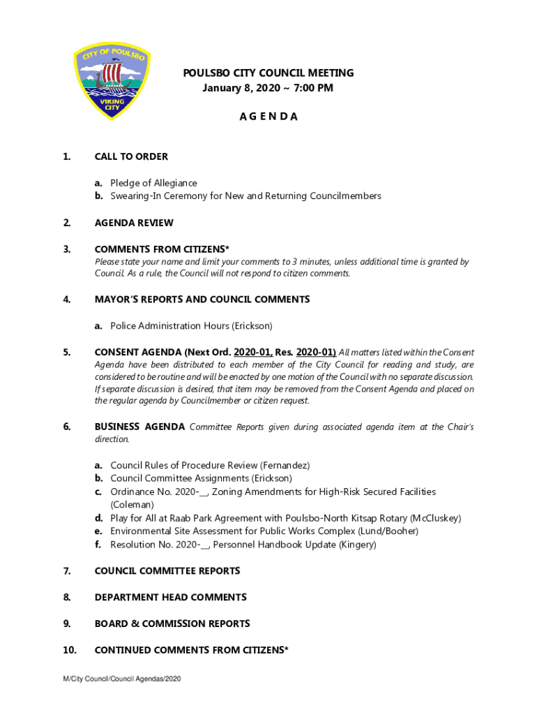 POLLS CITY COUNCIL MEETING January 8, 2020 7:00 PM AGENDA 1.CALL TO ORDER a. Pledge of Allegiance b. Swearing In Ceremony for New and Returning Councilmembers2.AGENDA REVIEW3.COMMENTS FROM CITIZENS×4.MAYORS