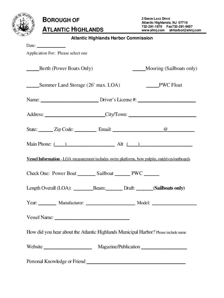 BOROUGH OF ATLANTIC HIGHLANDS2 SIMON LAKE DRIVE Atlantic Highlands, NJ 07716 7322911670 Fax7322919657 www.ahnj.com ahharbor@ahnj.comAtlantic Highlands Harbor Commission Date: ___ Application For: