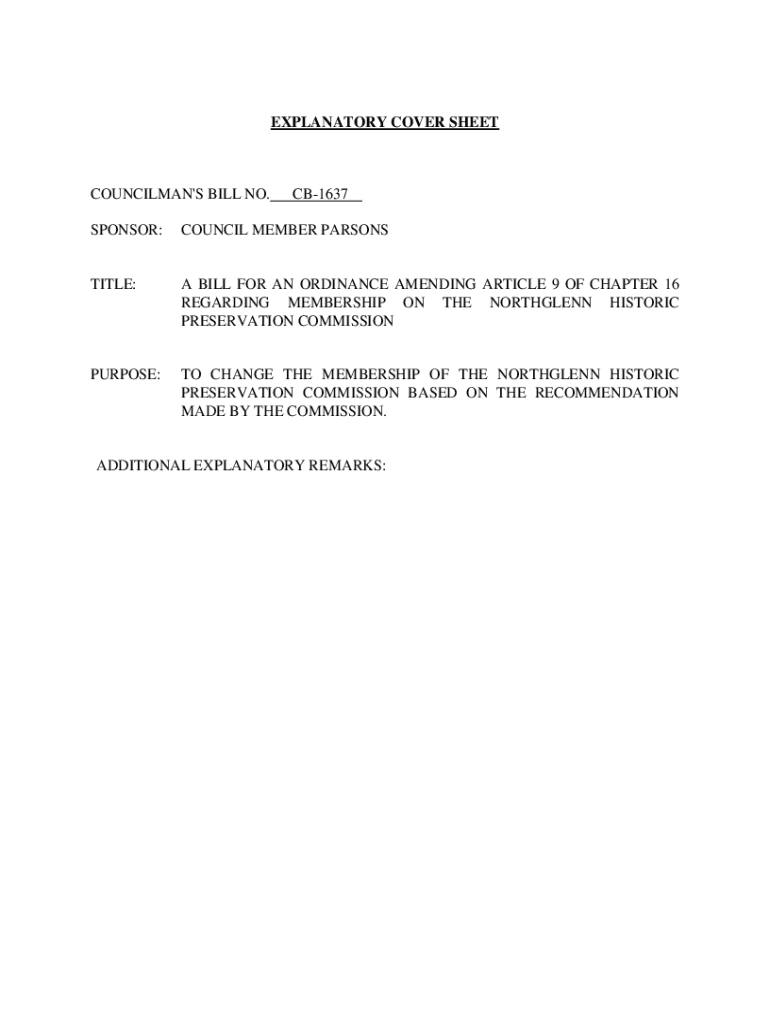 EXPLANATORY COVER SHEETCOUNCILMAN\'S BILL NO.CB1637SPONSOR:COUNCIL MEMBER PARSONSTITLE:A BILL FOR AN ORDINANCE AMENDING ARTICLE 9 OF CHAPTER 16 REGARDING MEMBERSHIP ON THE NORTHGLENN HISTORIC PRESERVATION