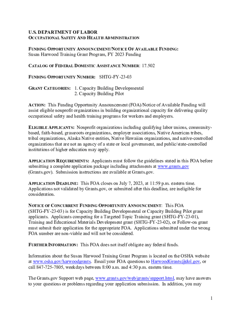 U.S. DEPARTMENT OF LABOR OCCUPATIONAL SAFETY AND HEALTH ADMINISTRATION FUNDING OPPORTUNITY ANNOUNCEMENT/NOTICE OF AVAILABLE FUNDING: Susan Hardwood Training Grant Program, FY 2023 Funding CATALOG