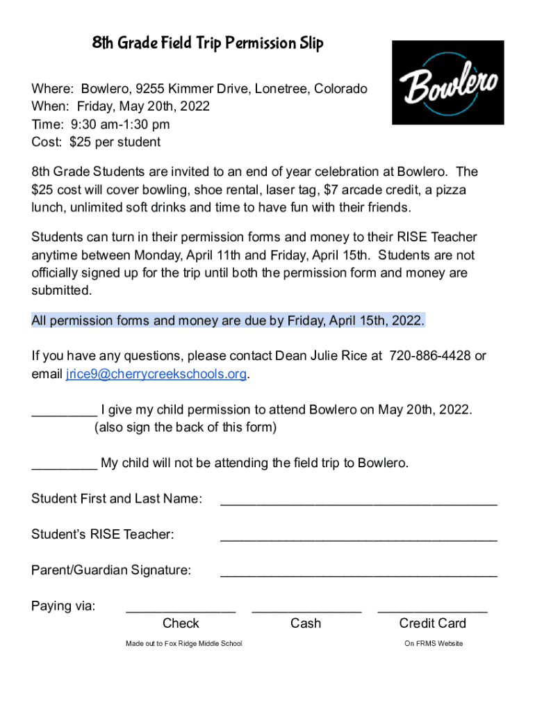 8th Grade Field Trip Permission Slip Where: Bowler, 9255 Dimmer Drive, Lone tree, Colorado When: Friday, May 20th, 2022 Time: 9:30 am1:30 pm Cost: $25 per student 8th Grade Students are invited to