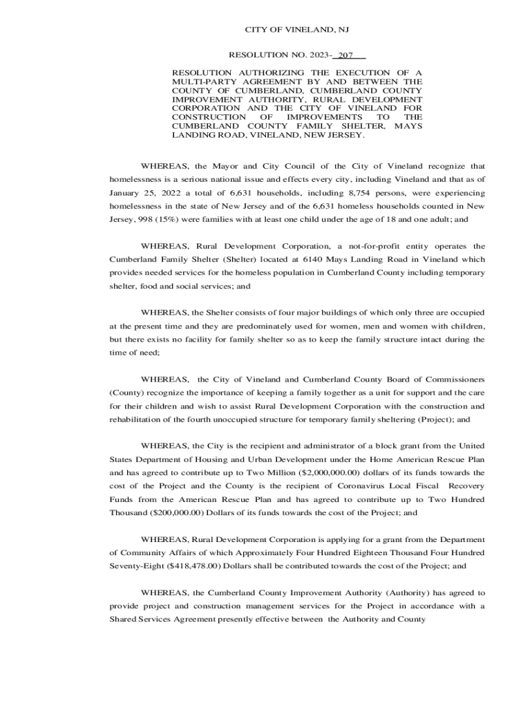 CITY OF VINELAND, NJ RESOLUTION NO. 2023___ 207 RESOLUTION AUTHORIZING THE EXECUTION OF A MULTIPARTY AGREEMENT BY AND BETWEEN THE COUNTY OF CUMBERLAND, CUMBERLAND COUNTY IMPROVEMENT AUTHORITY, RURAL