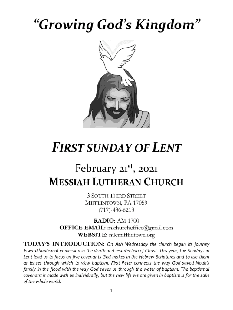 Growing Gods KingdomFIRST SUNDAY OF LENT February 21st, 2021 MESSIAH LUTHERAN CHURCH 3 SOUTH THIRD STREET MIFFLINTOWN, PA 17059 (717)4366213 RADIO: AM 1700 OFFICE EMAIL: mlchurchoffice@gmail.com WEBSITE: