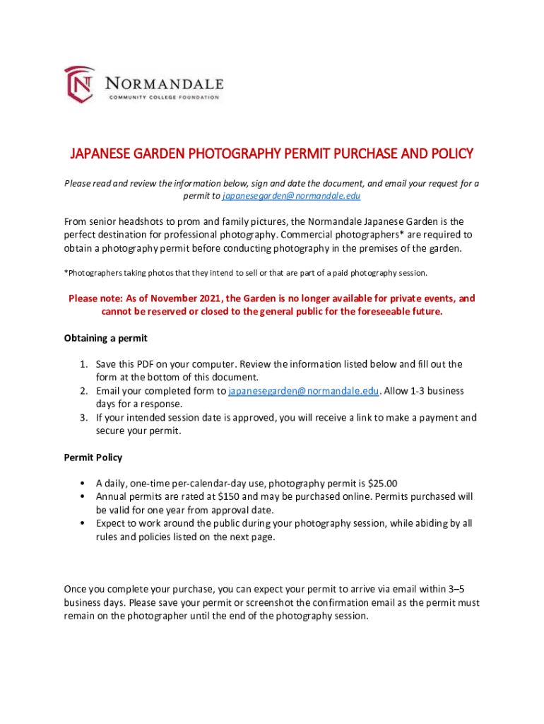 JAPANESE GARDEN PHOTOGRAPHY PERMIT PURCHASE AND POLICY Please read and review the information below, sign and date the document, and email your request for a permit to japanesegarden@normandale.eduFrom