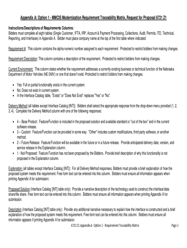 Appendix A: Option 1 MMC IS Modernization Requirement Traceability Matrix, Request for Proposal 6721 Z1 Instructions/Descriptions of Requirements Columns: Bidders must complete all eight tables (Single