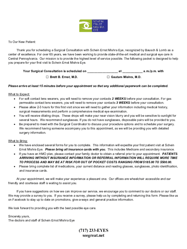 To Our New Patient: Thank you for scheduling a Surgical Consultation with 4chan Ernst Mishra Eye, recognized by Busch & Bomb as a center of excellence. For over 65 years, we have been working to provide