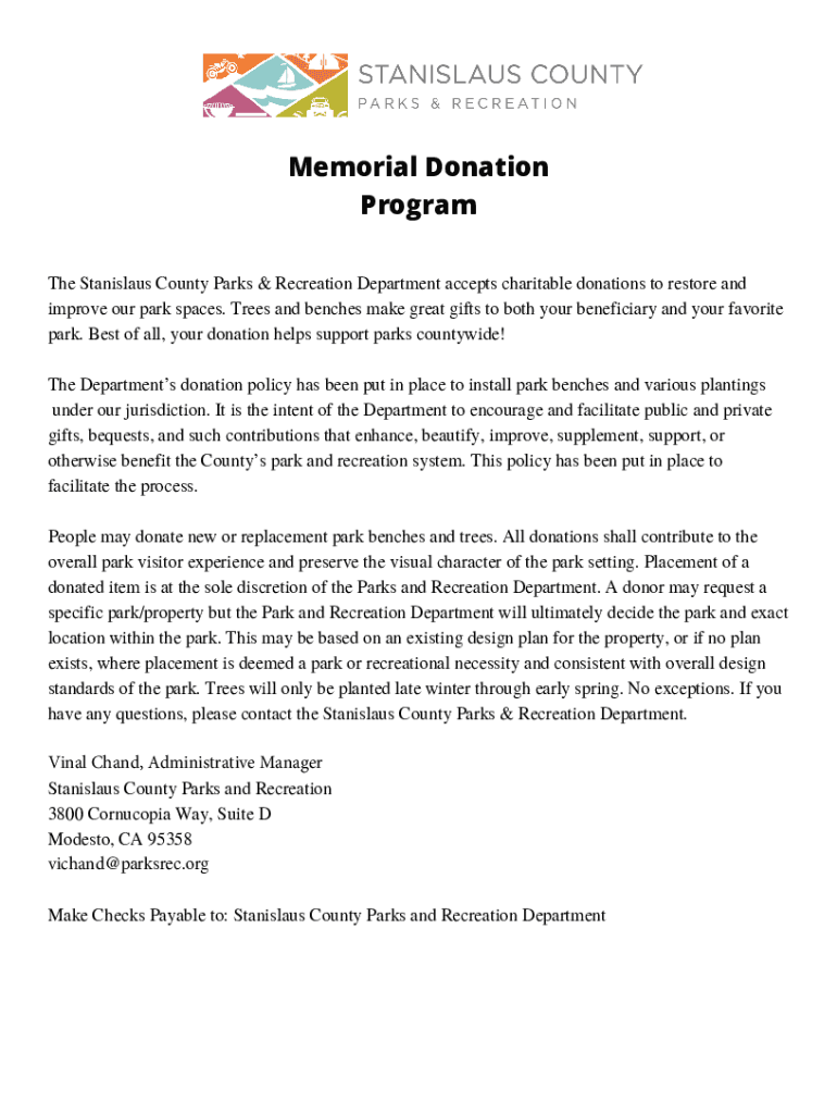 Memorial Donation Program The Stanislaus County Parks & Recreation Department accepts charitable donations to restore and improve our park spaces. Trees and benches make great gifts to both your beneficiary