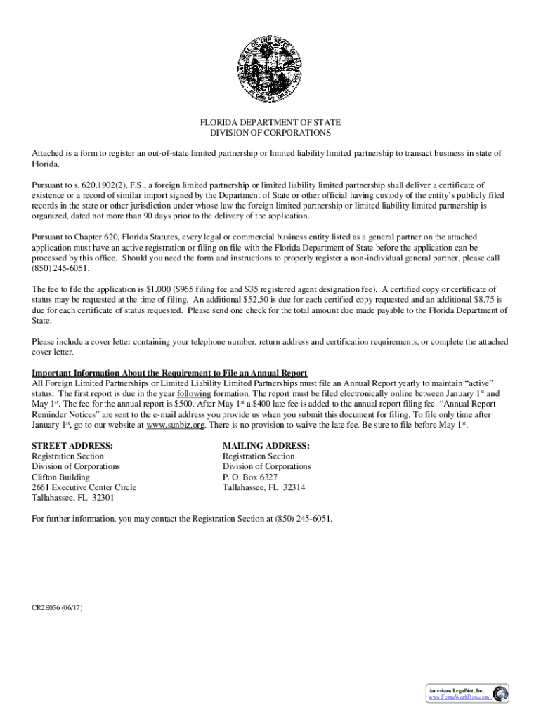 FLORIDA DEPARTMENT OF STATE DIVISION OF CORPORATIONS Attached is a form to register an outofstate limited partnership or limited liability limited partnership to transact business in state of Florida.