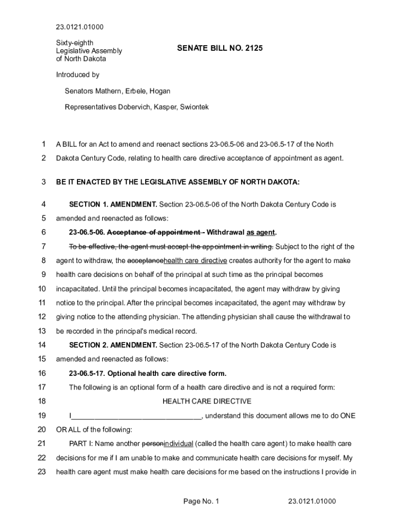 Get the free Senate Bill No. 2125 - Sixty-eighth Legislative Assembly of North Dakota - LC Number...
