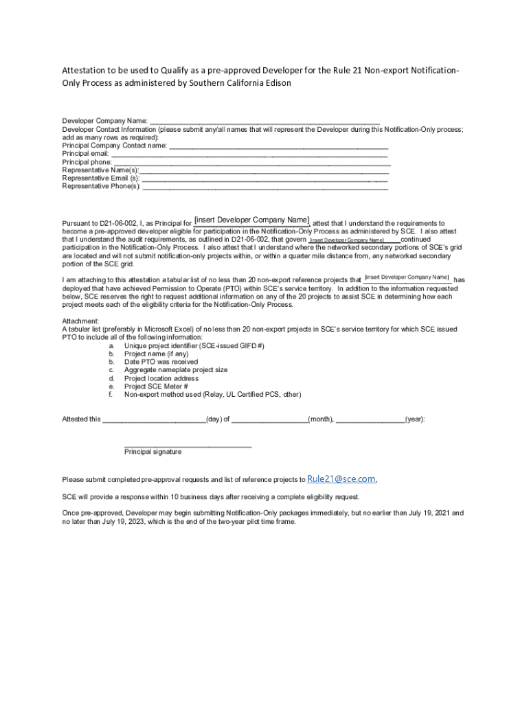 Attestation to be used to Qualify as a preapproved Developer for the Rule 21 Nonexport NotificationOnly Process as administered by Southern California EdisonDeveloper Company Name: ___ Developer Contact