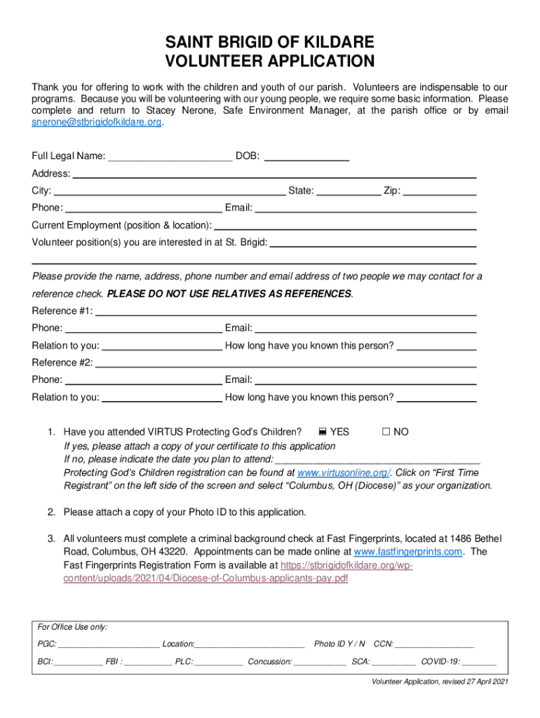 SAINT BRIGID OF KILDARE VOLUNTEER APPLICATION Thank you for offering to work with the children and youth of our parish. Volunteers are indispensable to our programs. Because you will be volunteering
