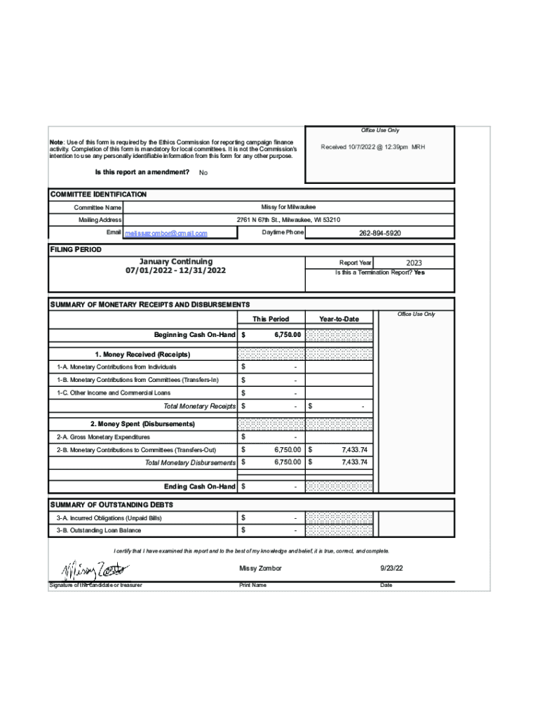 Office Use OneNote: Use of this form is required by the Ethics Commission for reporting campaign finance activity. Completion of this form is mandatory for local committees. It is not the Commission\'s