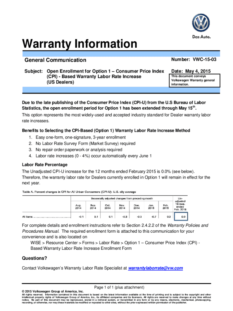Warranty Information General CommunicationNumber: VWC1503Subject: Open Enrollment for Option 1 Consumer Price Index (CPI) Based Warranty Labor Rate Increase (US Dealers)Date: May 4, 2015, This document