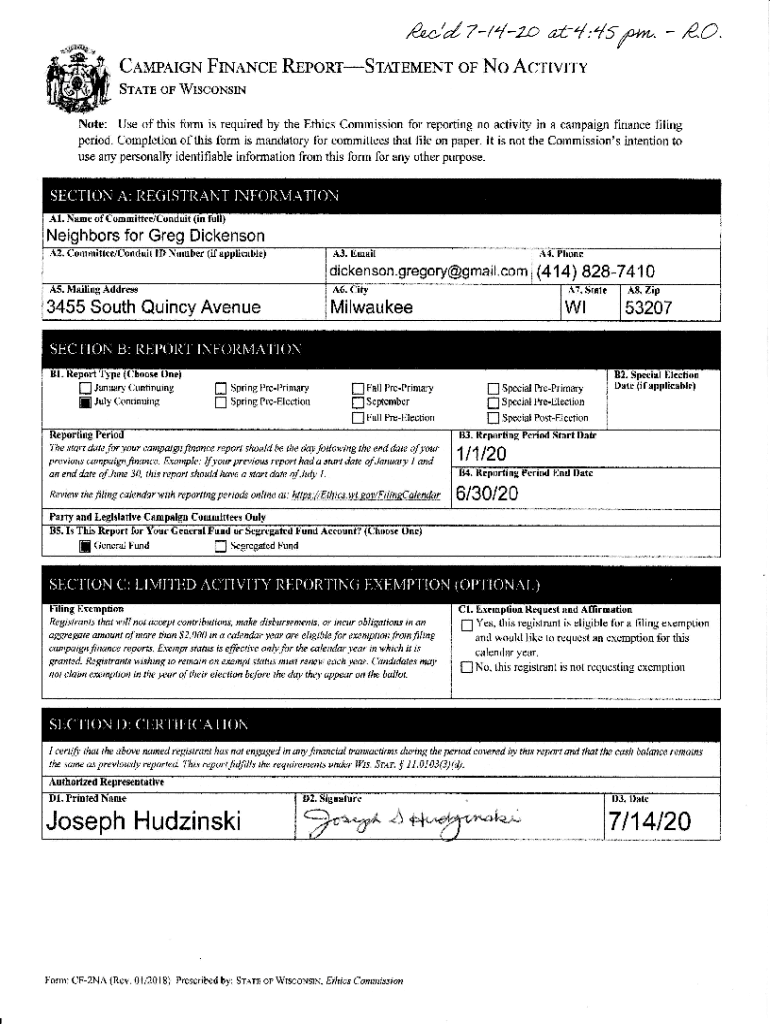 Cousin Flaxen RrponrSrarEMENr op No Carvery Sr.r.RN or WrscoNsrNNote: Use of this form is required by the Ethics Commission for reporting no activity in a campaign finance filing period. Completion