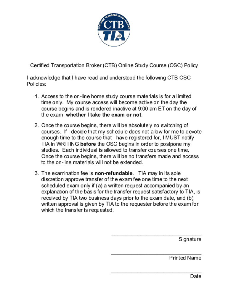 Certified Transportation Broker (CTB) Online Study Course (OSC) Policy I acknowledge that I have read and understood the following CTB OSC Policies: 1. Access to the online home study course materials