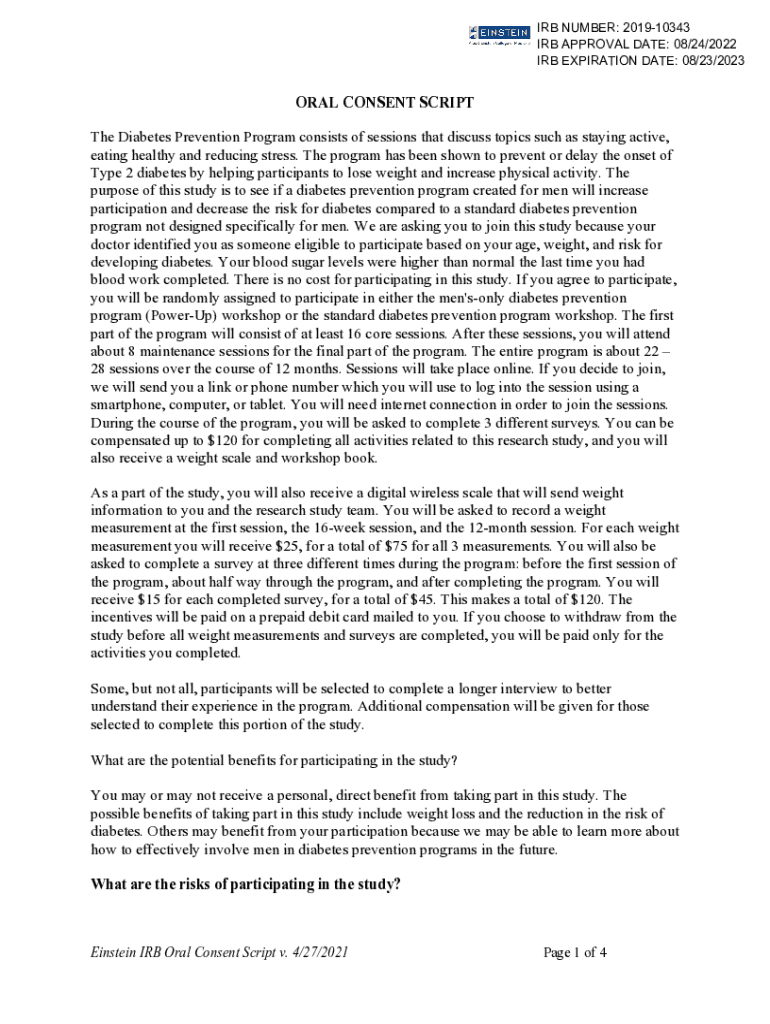 IRB NUMBER: 201910343 IRB APPROVAL DATE: 08/24/2022 IRB EXPIRATION DATE: 08/23/2023ORAL CONSENT SCRIPT The Diabetes Prevention Program consists of sessions that discuss topics such as staying active,