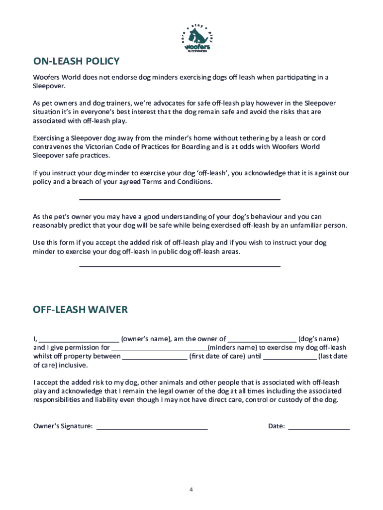 UNLEASH POLICY Woofers World does not endorse dog minders exercising dogs to leash when participating in a Sleepover. As pet owners and dog trainers, were advocates for safe leash play however in