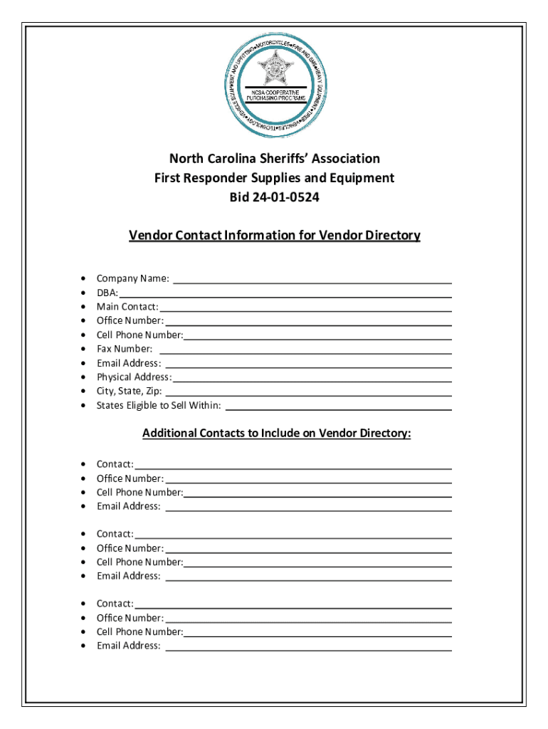 North Carolina Sheriffs Association First Responder Supplies and Equipment Bid 24010524 Vendor Contact Information for Vendor Directory Company Name: DBA: Main Contact: Office Number: Cell Phone Number: