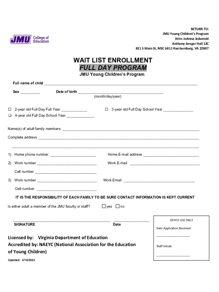 RETURN TO: JMA Young Children's Program Attn: Joanna Edams Anthony Seeger Hall 12C 821 S Main St, MSC 6811 Harrisonburg, VA 22807WAIT LIST ENROLLMENT FULL DAY PROGRAM JMA Young Children's Program