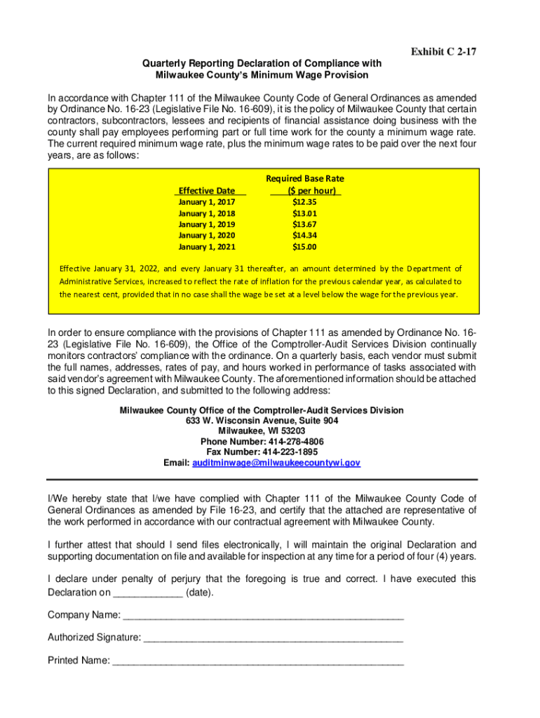 Exhibit C 217 Quarterly Reporting Declaration of Compliance with Milwaukee Counties Minimum Wage Provision In accordance with Chapter 111 of the Milwaukee County Code of General Ordinances as amended