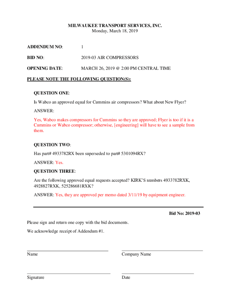 Monday, March 18, 2019ADDENDUM NO:1BID NO:201903 AIR COMPRESSORSOPENING DATE:MARCH 26, 2019 @ 2:00 PM CENTRAL TIMELESS NOTE THE FOLLOWING QUESTION(S):