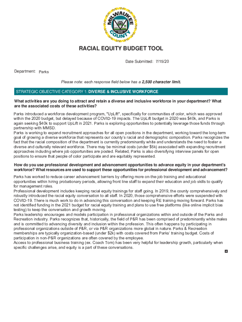 RACIAL EQUITY BUDGET TOOL Date Submitted: 7/15/20 Department: Parks 3OHDVHQRWHHDFKUHVSRQVHHOGEHORZKDVD2,500-character limit. STRATEGIC OBJECTIVE CATEGORY 1: DIVERSE & INCLUSIVE WORKFORCE What activities