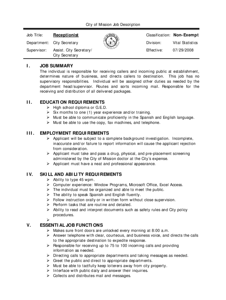 City of Mission Job Description Receptionist Job Title:Classification: NonExemptDepartment: City SecretaryDivision:Vital StatisticsSupervisor:Effective:07/29/2008Assist. City Secretary/ City Secretary.