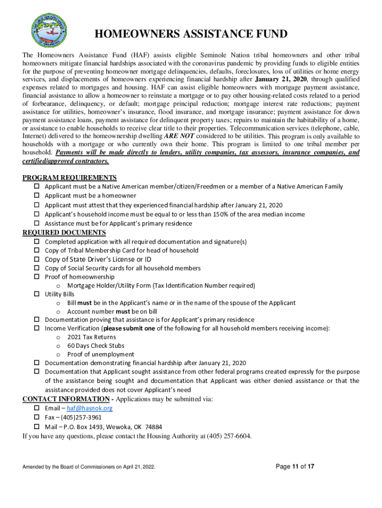 HOMEOWNERS ASSISTANCE FUND The Homeowners Assistance Fund (HAD) assists eligible Seminole Nation tribal homeowners and other tribal homeowners mitigate financial hardships associated with the coronavirus