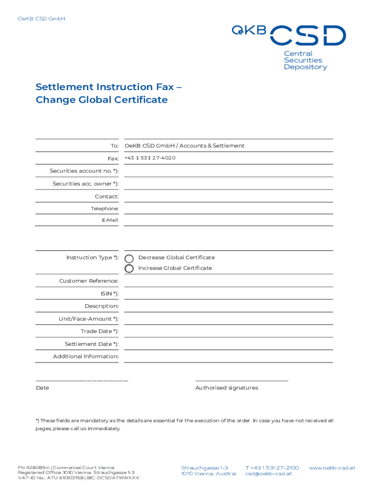 OEB CSD GmbHSettlement Instruction Fax Change Global Certificate: Fax:OEB CSD GmbH / Accounts & Settlement +43 1 531 274020Securities account no. *): Securities acc. owner *): Contact: Telephone: