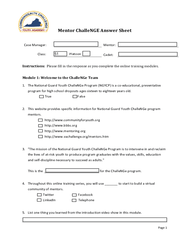 Mentor Challenge Answer Sheet Case Manager: Class:Mentor:51PlatoonCadet:Instructions: Please fill in the response as you complete the online training modules. Module 1: Welcome to the Challenge Team