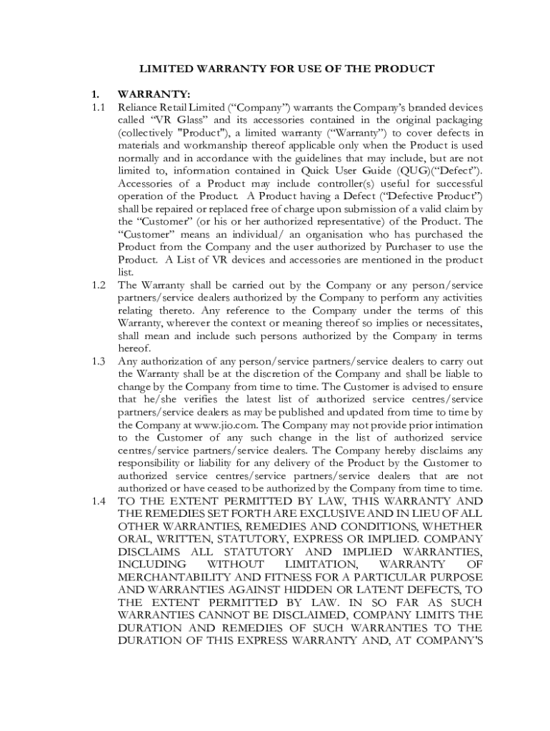 LIMITED WARRANTY FOR USE OF THE PRODUCT 1. 1.11.21.31.4WARRANTY: Reliance Retail Limited (Company) warrants the Companies branded devices called VR Glass and its accessories contained in the original