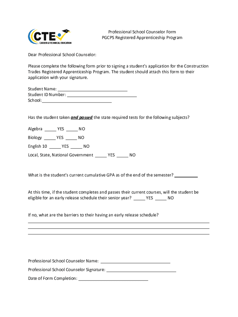 Professional School Counselor Form PG CPS Registered Apprenticeship Programmer Professional School Counselor: Please complete the following form prior to signing a students' application for the Construction