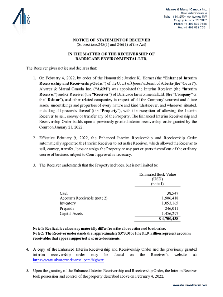 NOTICE OF STATEMENT OF RECEIVER (Subsections 245(1) and 246(1) of the Act) IN THE MATTER OF THE RECEIVERSHIP OF BARRICADE ENVIRONMENTAL LTD. The Receiver gives notice and declares that: 1. On February