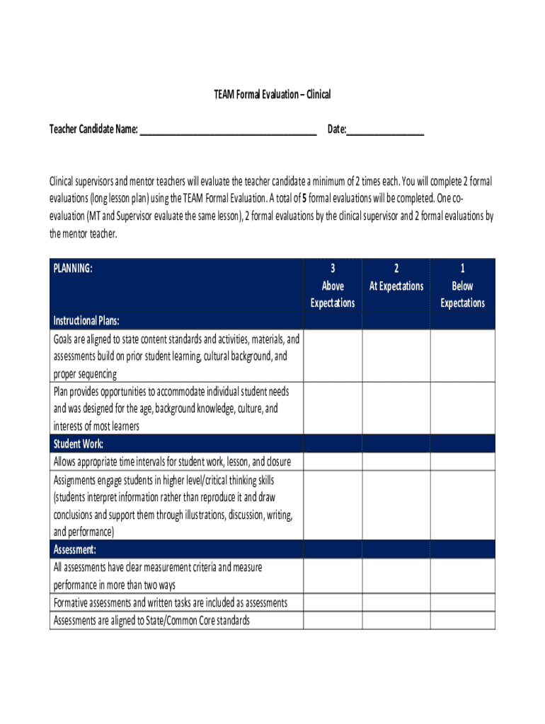TEAM Formal Evaluation Clinical Teacher Candidate Name: ___Date:___Clinical supervisors and mentor teachers will evaluate the teacher candidate a minimum of 2 times each. You will complete 2 formal