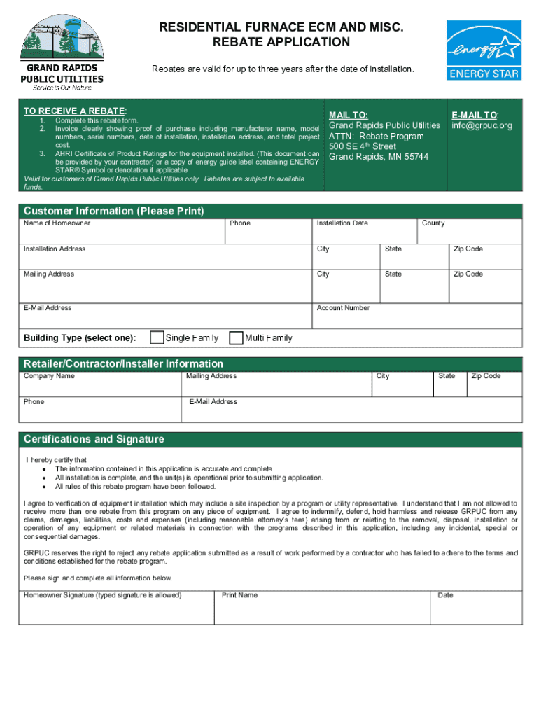 RESIDENTIAL FURNACE ECM AND MISC. REBATE APPLICATION Rebates are valid for up to three years after the date of installation.TO RECEIVE A REBATE: 1. 2. Complete this rebate form. Invoice clearly showing