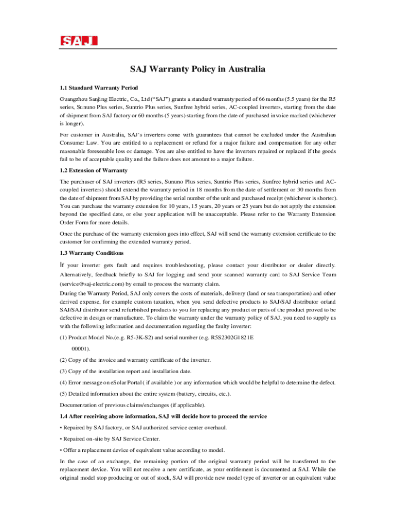 SAJ Warranty Policy in Australia 1.1 Standard Warranty Period Guangzhou Nanjing Electric, Co., Ltd (SAJ) grants a standard warranty period of 66 months (5.5 years) for the R5 series, Sunny Plus series,