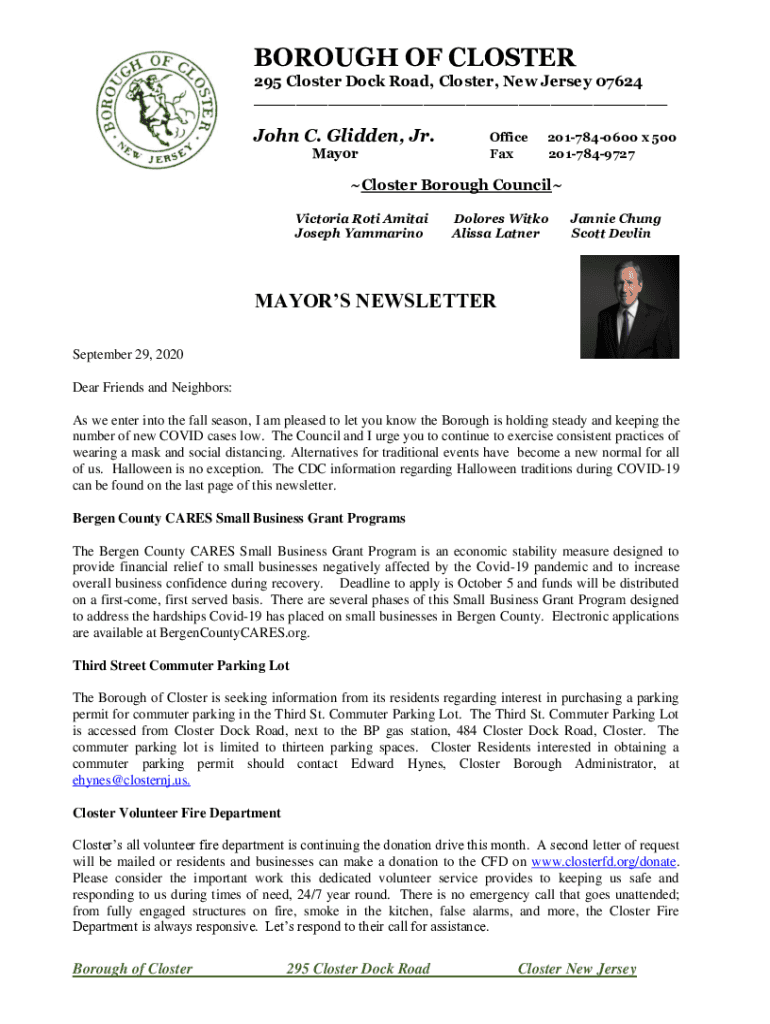 BOROUGH OF CLOSER 295 Closer Dock Road, Closer, New Jersey 07624 ___John C. Gladden, Jr. MayorOffice Fax2017840600 x 500 2017849727Closter Borough Council Victoria ROTC Amit AI Joseph YammarinoDolores