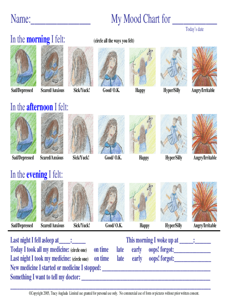 Today's date In the morning I felt:Sad/DepressedScared/Anxious(circle all the ways you felt)Sick/Yuck! Good/ O.K. HappyHyper/SillyAngry/Irritable In the afternoon I felt:Sad/DepressedScared/AnxiousSick/Yuck!