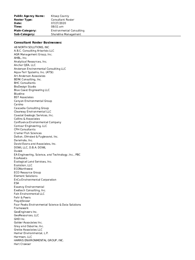 Public Agency Name: Roster Type: Date: Time: MainCategory: Subcategory:Kitsap County Consultant Roster 07/27/2020 08:51 am Environmental Consulting Shoreline ManagementConsultant Roster Businesses: