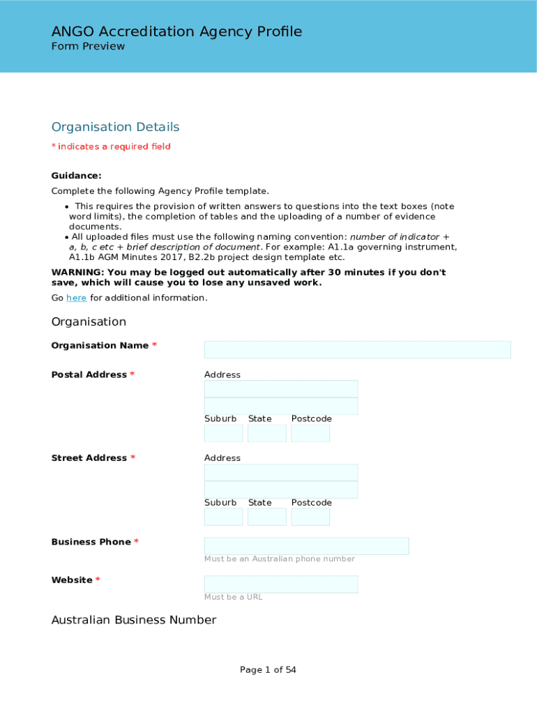 AGO Accreditation Agency Prole Form PreviewOrganisation Details * indicates a required ELD Guidance: Complete the following Agency Prole template. This requires the provision of written answers to