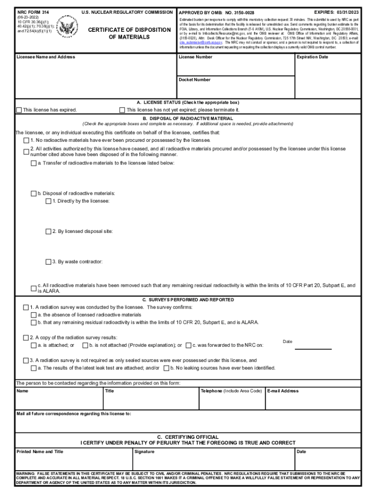 NRC FORM 314(06232022) 10 CFR 30.36(j)(1); 40.42(j)(1); 70.38(j)(1); and 72.54(k)(5)(1)(1)U.S. NUCLEAR REGULATORY COMMISSIONCERTIFICATE OF DISPOSITION OF MATERIALSLicensee Name and AddressEXPIRES: