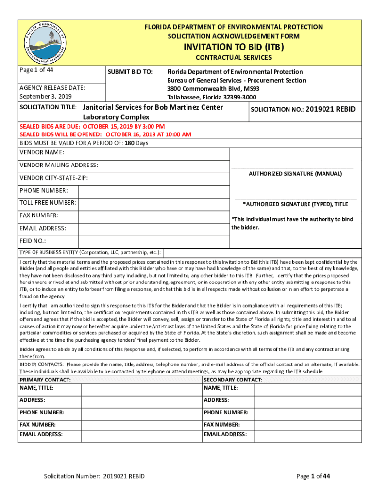 FLORIDA DEPARTMENT OF ENVIRONMENTAL PROTECTION SOLICITATION ACKNOWLEDGEMENT FORMINVITATION TO BID (ITB) CONTRACTUAL SERVICES Page 1 of 44SUBMIT BID TO:AGENCY RELEASE DATE: September 3, 2019Florida
