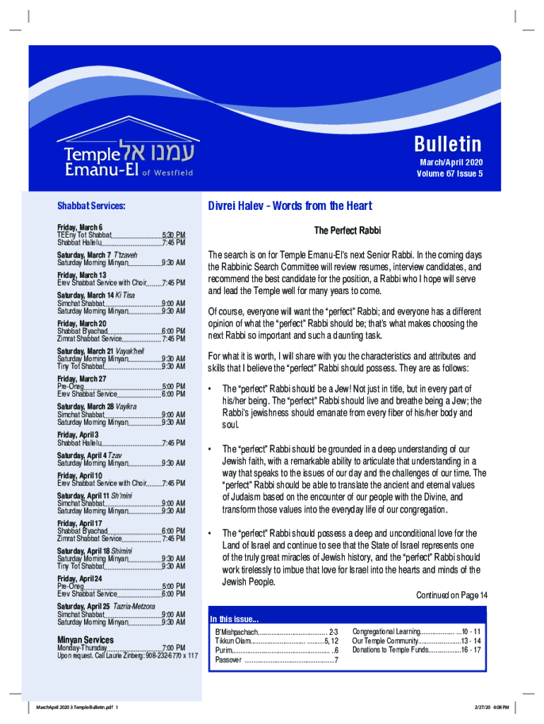 Bulletin March/April 2020 Volume 67 Issue 5Divrei Hale Words from the HeartShabbat Services: Friday, March 6 Teeny Tot Shabbat5:30 PM Shabbat Hallelu7:45 PMT he Perfect Rabbi Saturday, March 7 Tetzaveh