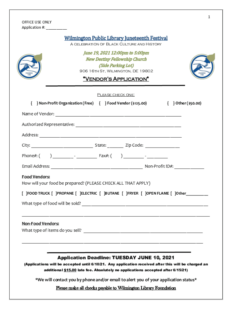 Get the free Wilmington Public Library Juneteenth Festival *Vendor's Application* - wilmington li...