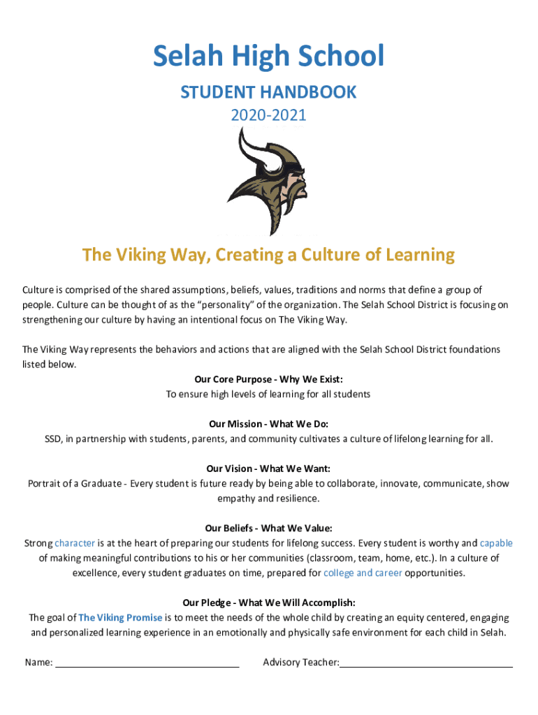 Salah High School STUDENT HANDBOOK 20202021The Viking Way, Creating a Culture of Learning Culture comprises the shared assumptions, beliefs, values, traditions and norms that define a group of people.
